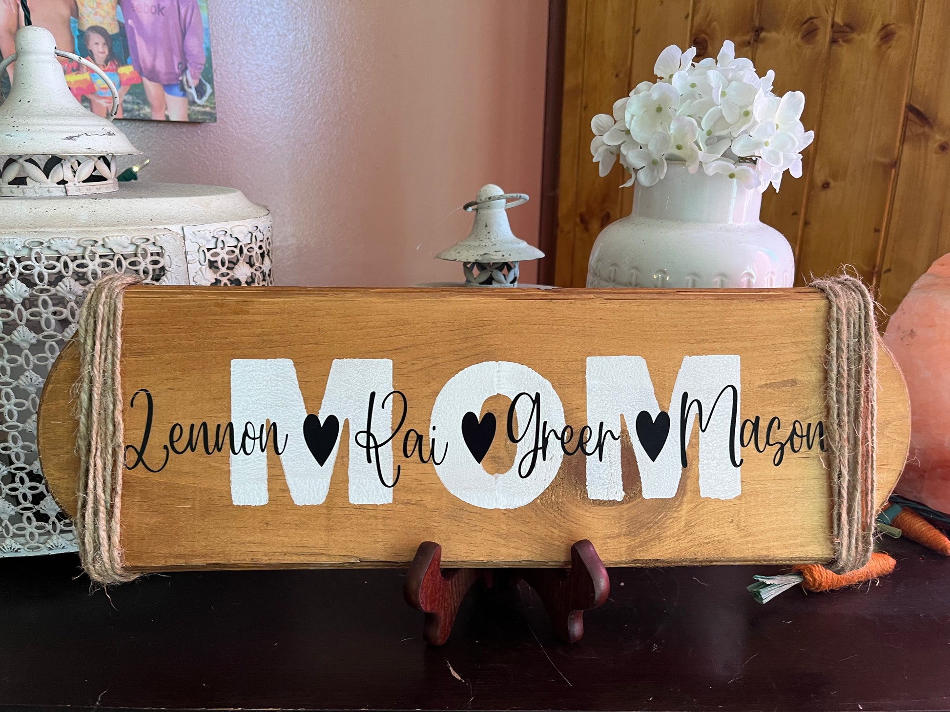 Custom wooden MOM signs, 18 inches long, with twine wrapped edges, makes the perfect gift or added decor to your own home. You can customize, with color, background name, such as Mimi, Nanny, dad, family last name with husband and wife as the forefront name. You can decide it all! Please leave all personalization in the notes to seller upon check out.